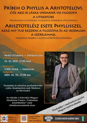 10.10.2025, 17:00 hod. | Mestské kultúrne stredisko vo Fiľakove - bábková sála | Dňa 10. októbra 2025 bude mať fiľakovské publikum jedinečnú príležitosť zúčastniť sa prednášky prof. Andrása Mészárosa, historika filozofie. Prednáška (v maďarskom jazyku) je súčasťou prednáškového cyklu „Veda zrozumiteľne”, ktorý organizuje Akademická rada Maďarov na Slovensku. Srdečne pozývame všetkých záujemcov. Názov prednášky:„Príbeh o Phyllis a Aristote