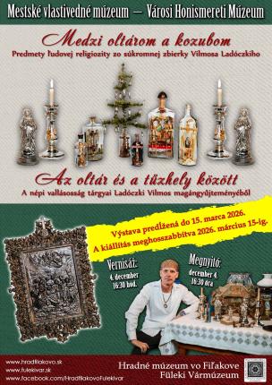 04. december 2025, 16:30 hod. – 15. marec 2026 | Mestské vlastivedné múzeum | Mesiac december už tradične sprevádza posledná výstava roka v Mestskom vlastivednom múzeu vo Fiľakove. Tento rok sa tu 4. decembra 2025 o 16:30 hod. otvorí výstava s názvom „Medzi oltárom a kozubom – predmety ľudovej religiozity zo súkromnej zbierky Vilmosa Ladóczkiho“, ktorej predchodca bol pred dvomi rokmi uvedený v Balážskych Ďarmotách. Zberateľ staroži -
