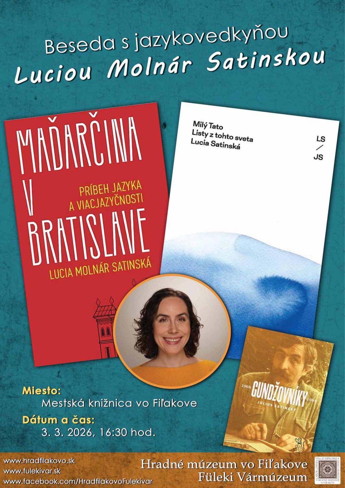 Marcovým hosťom Mestskej knižnice vo Fiľakove bude známa slovenská jazykovedkyňa, prekladateľka a spisovateľka PhDr. Lucia Molnár Satinská, PhD. Bratislavská autorka vyštudovala na Filozofickej fakulte Karlovej univerzity v Prahe a od roku 2011 pôsobí v Jazykovednom ústave Ľudovíta Štúra SAV. Vo svojej vedeckej činnosti sa venuje témam viacjazyčnosti na Slovensku, jazykovej politike či rodovo citlivému jazyku. Vzhľadom na jej zameranie je jej návšteva vo Fiľakove symbolická, keďže sa dlhodobo venuje popularizácii slovenčiny, maďarčiny a ich vzájomného spolužitia. Významnú časť jej literárnych aktivít tvorí preklad beletrie z maďarského jazyka a spracovanie rukopisnej pozostalosti jej otca, Júliusa Satinského. Je editorkou viacerých úspešných titulov, ako sú rozšírené vydanie Rozprávok uja Klobásu, knihy Listy z onoho sveta, Expedície, Listy Oľge či Gundžovníky. Miestnemu publiku predstaví svoju doterajšiu tvorbu – od odbornej literatúry až po beletriu. Osobitné miesto v diskusii bude patriť epištolárnej literatúre, konkrétne osobným listom venovaným jej otcovi, ktoré vyšli pod názvom Milý Tato – Listy z tohto sveta. Spolu s manželom, Csabom Molnárom, sú autormi seriálu Pressburg. Táto viacjazyčná komediálno-dramatická miniséria zo súčasnosti sleduje životy rôznorodých postáv v Bratislave a poukazuje na spolužitie jazykov, kultúr a identít na Slovensku. Hlavnou myšlienkou je ukázať realitu menšín s humorom, ale aj kritickým pohľadom na spoločnosť. Seriál odvysielala RTVS a je dostupný aj na Netflixe. Podujatie ponúkne návštevníkom nielen hlbší pohľad do literárnej tvorby rodiny Satinských, ale aj priestor na spoločnú diskusiu a autogramiádu. Beseda sa uskutoční v utorok 3. marca 2026 o 16:30 hod. Pozývame všetkých milovníkov dobrej literatúry!