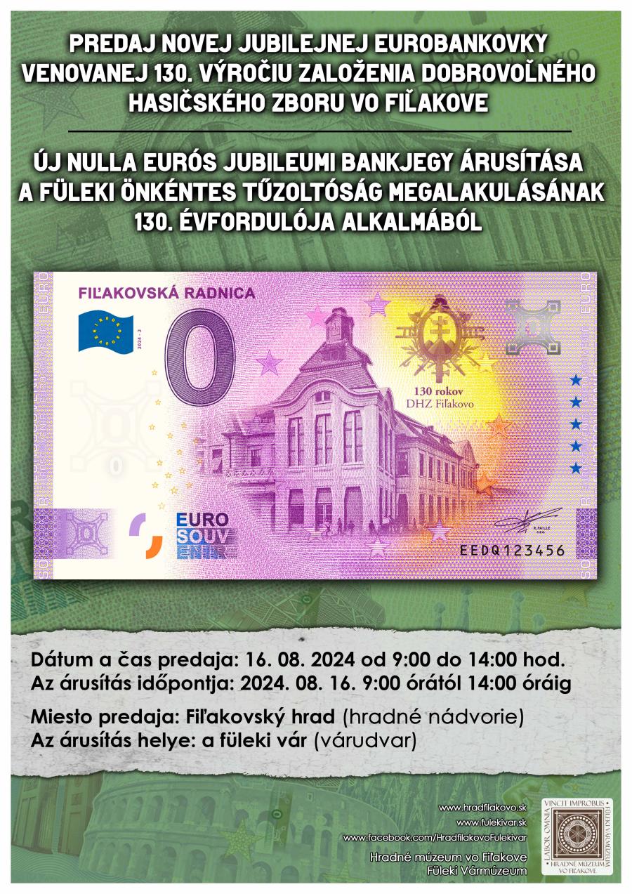 V deň vernisáže výstavy „130 rokov Dobrovoľného hasičského zboru vo Fiľakove”, 16. augusta 2024 bude od 9:00 do 14:00 hod. prebiehať prvotný predaj nulovej eurobankovky, vydanej pri príležitosti okrúhleho výročia založenia spolku. Bankovka s vyobrazením radnice a erbu DHZ z r. 1929 sa bude predávať na nádvorí dolného hradu. Následne budú bankovky v predaji v kancelárii NTIC a v hradnej pokladni.Zverejnené 9.8.2024, Aktualizované: 9.4.2025