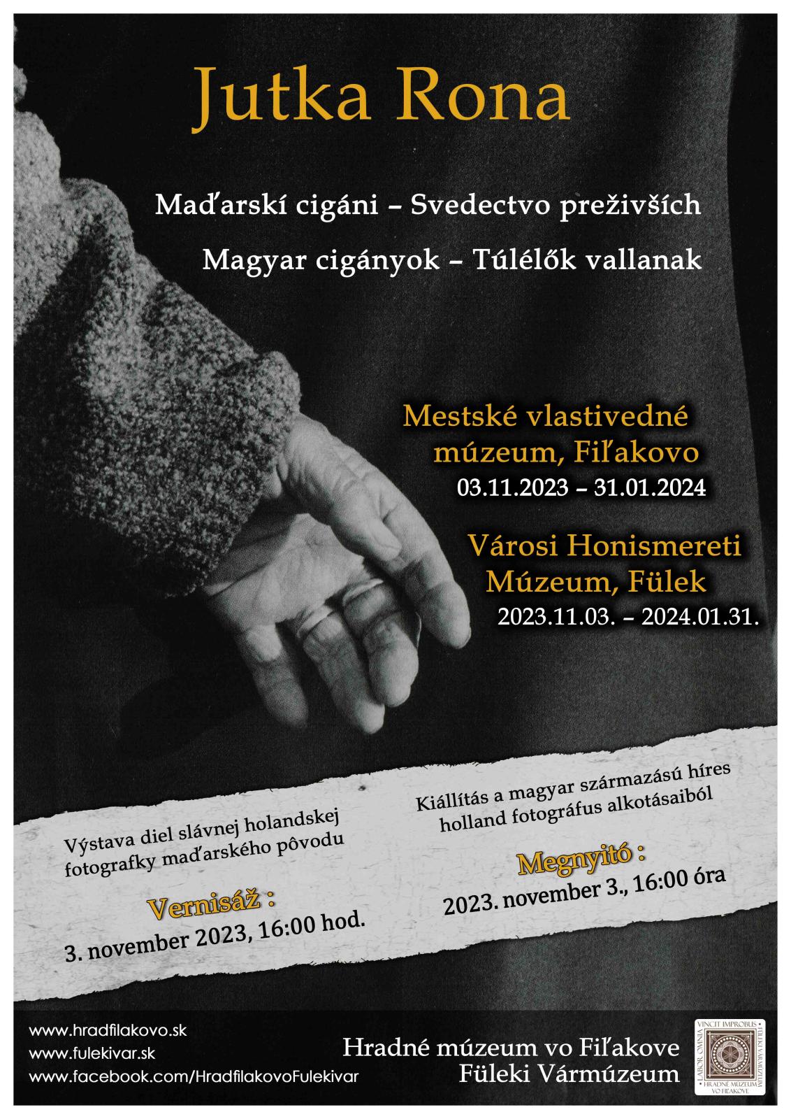 Hradné múzeum vo Fiľakove srdečne pozýva všetkých záujemcov na vernisáž výstavy diel slávnej holandskej fotografky Jutky Rona, ktorá nesie názov Maďarskí cigáni – Svedectvo preživších. Fotografka maďarského pôvodu mala len dva roky, keď jej rodičia emigrovali do Holandska. Remeslu sa vyučila už v tejto krajine. Fotografovaniu sa začala vážnejšie venovať po ukončení vysokoškolského štúdia, čomu pravdepodobne výrazne napomohla aj podpora jej otca, Imreho Rónu, ktorý pracoval ako fotograf a viedol fotoagentúru, no vyskúšal si aj prácu novinára v Amsterdame. Na začiatku svojej kariéry bola Jutka Rona predovšetkým divadelnou fotografkou, potom sa prvotne stala uznávanou portrétnou fotografkou, neskôr autorkou cestopisov a fotoreportérkou. Počas jej života bolo vydaných 10 fotoalbumov a jej snímky boli vystavené po celom svete. V roku 2006 sa v nej pri jednej návšteve výstavy budapeštianskeho Dokumentačného strediska holokaustu zrodila myšlienka, že by rada pripomenula aj pamiatku holokaustu maďarských Rómov, čoho výsledkom bolo, že v roku 2010 vyšiel v Holandsku zväzok s názvom Maďarskí cigáni, Svedectvo preživších. Album sa zameriava na rómskych preživších v ich vlastnom prostredí, v mnohých prípadoch zobrazených spoločne s rodinnými príslušníkmi, a obsahuje rozhovory, v ktorých sa odvíjajú osudy jednotlivcov. Zábery odrážajú pre mnohých dnes už nezvyčajnú rodinnú spolupatričnosť, solidaritu, bezhraničnú lásku k deťom a tiež neskalenú radosť zo života. Rómske rodiny prijali Jutkin záujem a súcit, vďaka čomu vyrozprávali príbehy zo svojej hlboko pochovanej minulosti. Kniha Jutky Rona a výber zostavený z jej fotografií sú nielen spomienkou na holokaust, ale aj liekom proti nenávisti.