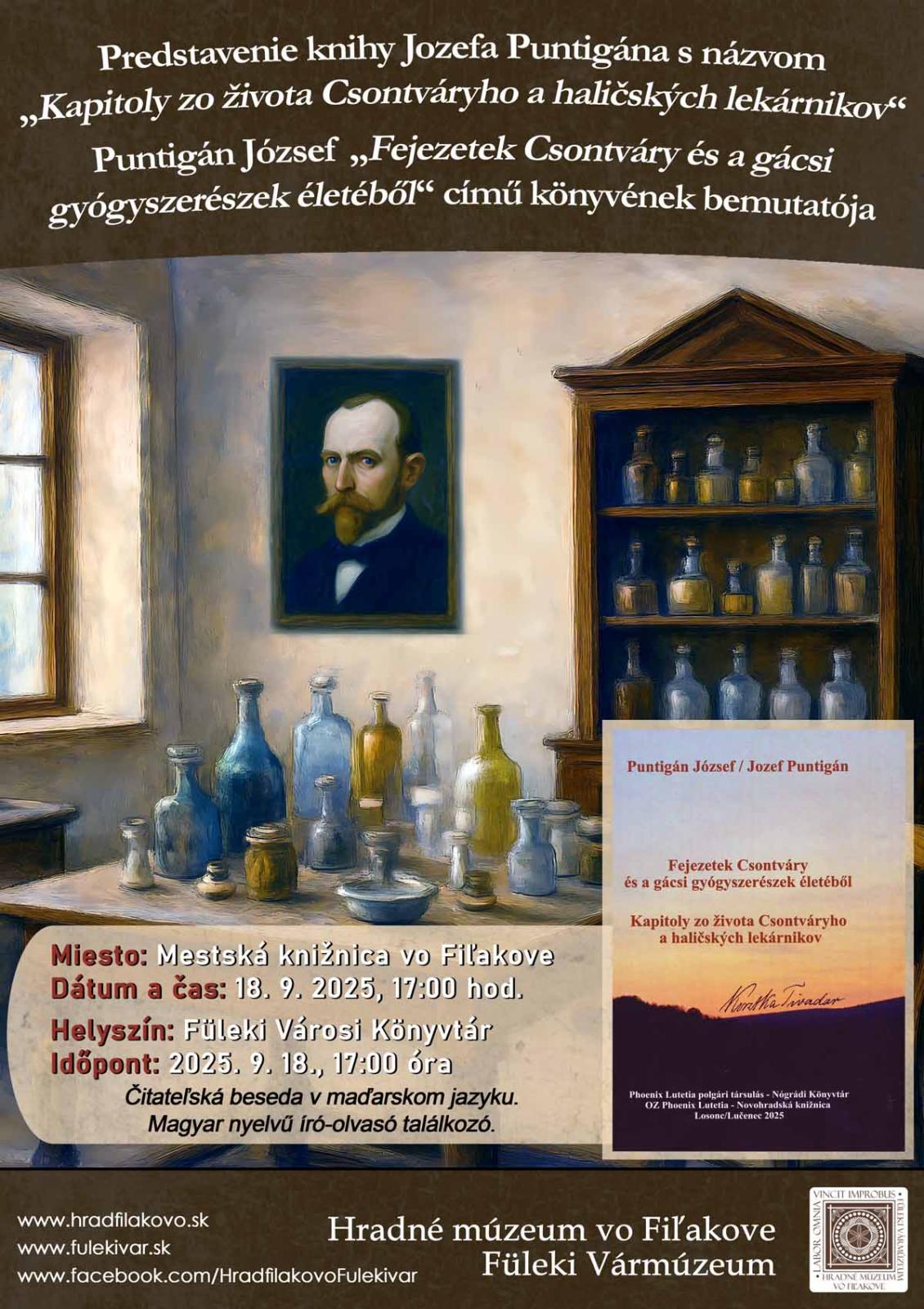 Po haličskom a lučenskom uvedení bude mať aj fiľakovské publikum možnosť oboznámiť sa s novou dvojjazyčnou, slovensko-maďarskou knihou autora viacerých miestnych publikácií a regionálneho historika RNDr. Jozefa Puntigána s názvom Kapitoly zo života Csontváryho a haličských lekárnikov. Jej témou je život a pôsobenie maliara a lekárnika Tivadara Kosztku Csontváryho v Haliči, ako aj osudy ďalších lekárnikov, ktorí následne prevádzkovali miestnu apatéku. Otvorená bola v decembri 1884 ako prvá v obci, a preto sa tento známy lekárnik a umelec považuje za zakladateľa haličského lekárnictva. Bohato ilustrovaná publikácia umožní čitateľovi vytvoriť si reálnu predstavu o spoločenskom živote miestnej komunity v predmetnom období, ohraničenom druhou polovicou 19. a prvou polovicou 20. storočia, a to prostredníctvom zaujímavých informácií o vlastníkoch a nájomníkoch lekárne, ako aj ďalších osobnostiach, ktoré zohrávali významnú rolu v Csontváryho živote. Obsahuje súčasné aj staré fotografie o budove niekdajšej lekárne, podobizne lekárnikov a ich rodinných príslušníkov, úryvky z dobových novinových článkov, historické pohľadnice, citácie z korešpondencie Csontváryho, a v neposlednom rade aj ukážku z jeho maliarskej tvorby. Prezentácia v maďarskom jazyku v podaní samotného autora sa uskutoční 18. septembra 2025, o 17:00 hodine v Mestskej knižnici vo Fiľakove. Všetci záujemcovia sú srdečne vítaní!