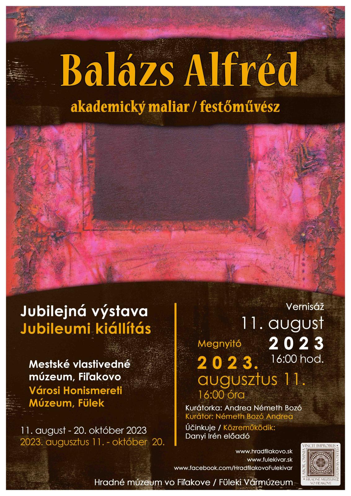 V rámci tohtoročných osláv Palóckych dní a Dní mesta Fiľakovo pripravuje Hradné múzeum novú dočasnú výstavu, ktorá bude inštalovaná v galérii Mestského vlastivedného múzea. Dňa 11. augusta 2023 o 16:00 hodine sa uskutoční vernisáž jubilejnej výstavy diel maliara Alfréda Balázsa, ktorej kurátorkou je historička umenia Novohradského múzea a galérie v Lučenci, Andrea Németh Bozó.