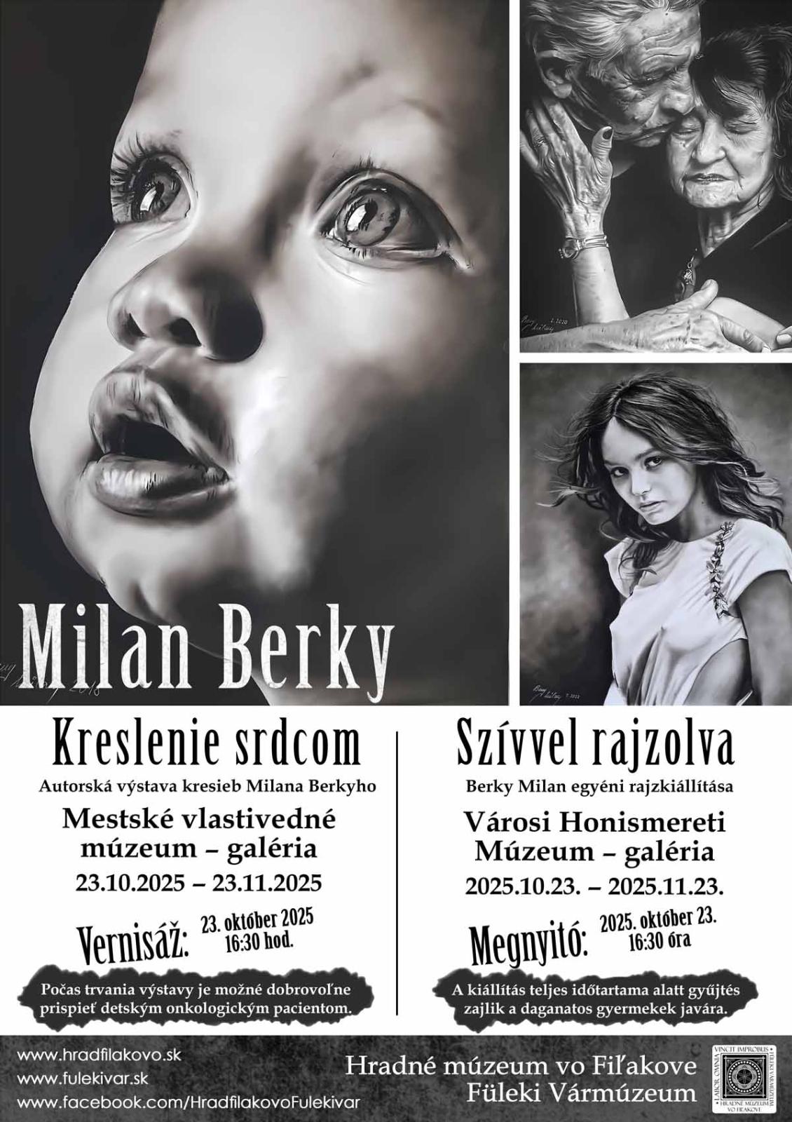 Od 23. októbra 2025 bude galéria Mestského vlastivedného múzea hostiť výstavu kresieb amatérskeho výtvarníka Milana Berkyho s názvom „Kreslenie srdcom“. Autor, známy nielen v Lučenci a Novohrade, sa umeleckej činnosti začal venovať potom, ako po takmer 35 rokoch prišiel o prácu u železníc. Svoj novonadobudnutý voľný čas začal venovať kresleniu, keďže táto záľuba ho uchvátila už v detstve. V tvorbe ho najviac oslovilo kreslenie portrétov, pričom sa snaží do svojich diel vdýchnuť život. Jeho cieľom je dostať sa do povedomia ľudí a umelcov, a vystavovať svoje práce doma a v zahraničí, čo sa mu v súčasnosti aj reálne napĺňa. Prezentoval sa už v mnohých mestách Slovenska, v krajinách ako sú Čechy, Nemecko, Rakúsko, Švajčiarsko, a získal niekoľko ocenení. Od roku 2020 má vlastnú galériu v Lučenci, kde vystavuje svoje diela a organizuje kurzy kreslenia. Zaujal mnohých umelcov, ktorí mu vyjadrujú uznanie a podporu, čoho príkladom je aj výrok Jiřího Doležala, organizátora Open Artfestu Praha: „Keď sa pozriete na jeho práce, na prvý pohľad viete, čo tým chce povedať. Vždy, keď pristúpite bližšie, aby ste vnímali detaily jednotlivých obrazov, neprestanete obdivovať jeho precíznosť”. Obrazy Milana Berkyho sa dostali aj k významným osobnostiam, ako napríklad k pápežovi Františkovi či bývalej prezidentke Zuzane Čaputovej. Je zakladateľom internetovej skupiny s názvom Kreslenie srdcom, ako aj autorom projektu Heart, ktorý slúžil na podporu liečby detských onkologických pacientov. Do projektu sa zapojilo viac ako 200 umelcov. V súčasnosti prebieha ďalší úspešný charitatívny projekt, takisto zameraný na pomoc chorým deťom. Počas trvania fiľakovskej výstavy bude možné dobrovoľne prispieť na tento účel. Vernisáž výstavy, ktorá bude sprístupnená do 23. novembra 2025, sa uskutoční o 16:30 hodine. Všetci záujemcovia sú srdečne vítaní!