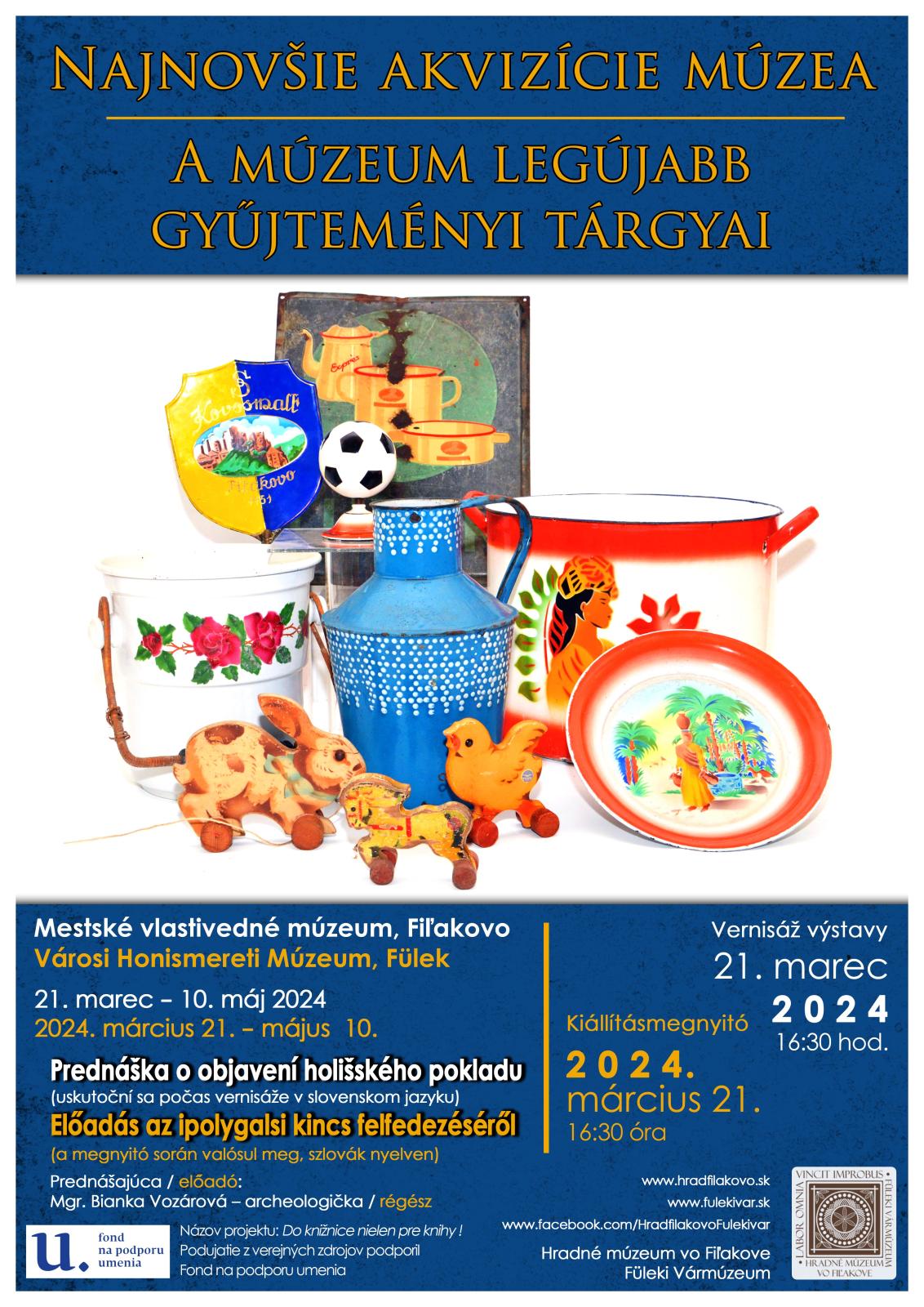 Hradné múzeum vo Fiľakove pozýva milovníkov histórie a všetkých záujemcov na vernisáž jubilejnej výstavy s názvom Najnovšie akvizície múzea. Mestské vlastivedné múzeum funguje v priestoroch miestnej reduty (Vigadó) od roku 1994. Takmer presne dvadsať rokov po jeho otvorení sa v roku 2014 sprístupnila nová expozícia s názvom „Od fiľakovskej palmy k svetoznámemu kohútovi“. Keďže jednou z hlavných aktivít Hradného múzea je aj naďalej akvizičná činnosť, inštitúcia sa snaží sústavne dopĺňať svoj zbierkový fond. Novonadobudnuté artefakty prezentuje verejnosti a zároveň ich uchováva pre budúce generácie. Pri horeuvedenej jubilejnej príležitosti otvára múzeum novú dočasnú výstavu, prístupnú do 10. mája 2024, a prezentujúcu najnovšie zbierkové predmety múzejného fondu, ktorý sa za uplynulé roky obohatil niekoľkými unikátmi z rôznych odborov. Súčasťou expozície bude zaujímavý archeologický materiál z rôznych období, pochádzajúci z terénnych prieskumov v regióne, ale aj nálezy zo záchranného výskumu hradu Šomoška, či stredoveké nádoby z Fiľakova, ktoré boli odcudzené zo zbierok právneho predchodcu inštitúcie. Z nedávno realizovaného výskumu v holišskom kostole pochádza vzácny poklad zlatých a strieborných mincí zo 16. storočia, ktorý bude fotograficky prezentovaný tiež na tejto výstave. Po vernisáži si návštevníci budú môcť vypočuť aj zaujímavú prednášku o jeho nájdení.