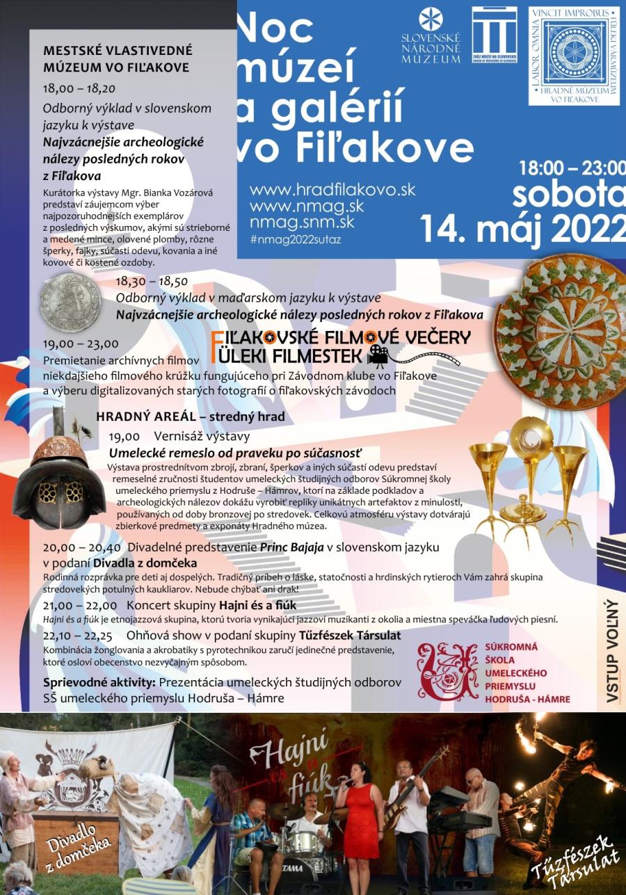 Po dvojročnej prestávke sa Hradné múzeum opäť zapája do tradičného celoslovenského podujatia Noc múzeí a galérií, ktoré sa uskutoční 14. mája 2022. Program sa začne v Mestskom vlastivednom múzeu o 18:00 hod., kde archeologička múzea predstaví záujemcom výstavu „Najvzácnejšie archeologické nálezy posledných rokov z Fiľakova“. Odborný výklad si môžu návštevníci neskôr vypočuť aj v maďarskom jazyku. Záujemcovia sa budú môcť oboznámiť s najvýznamnejZverejnené 9.5.2022, Aktualizované: 27.9.2024