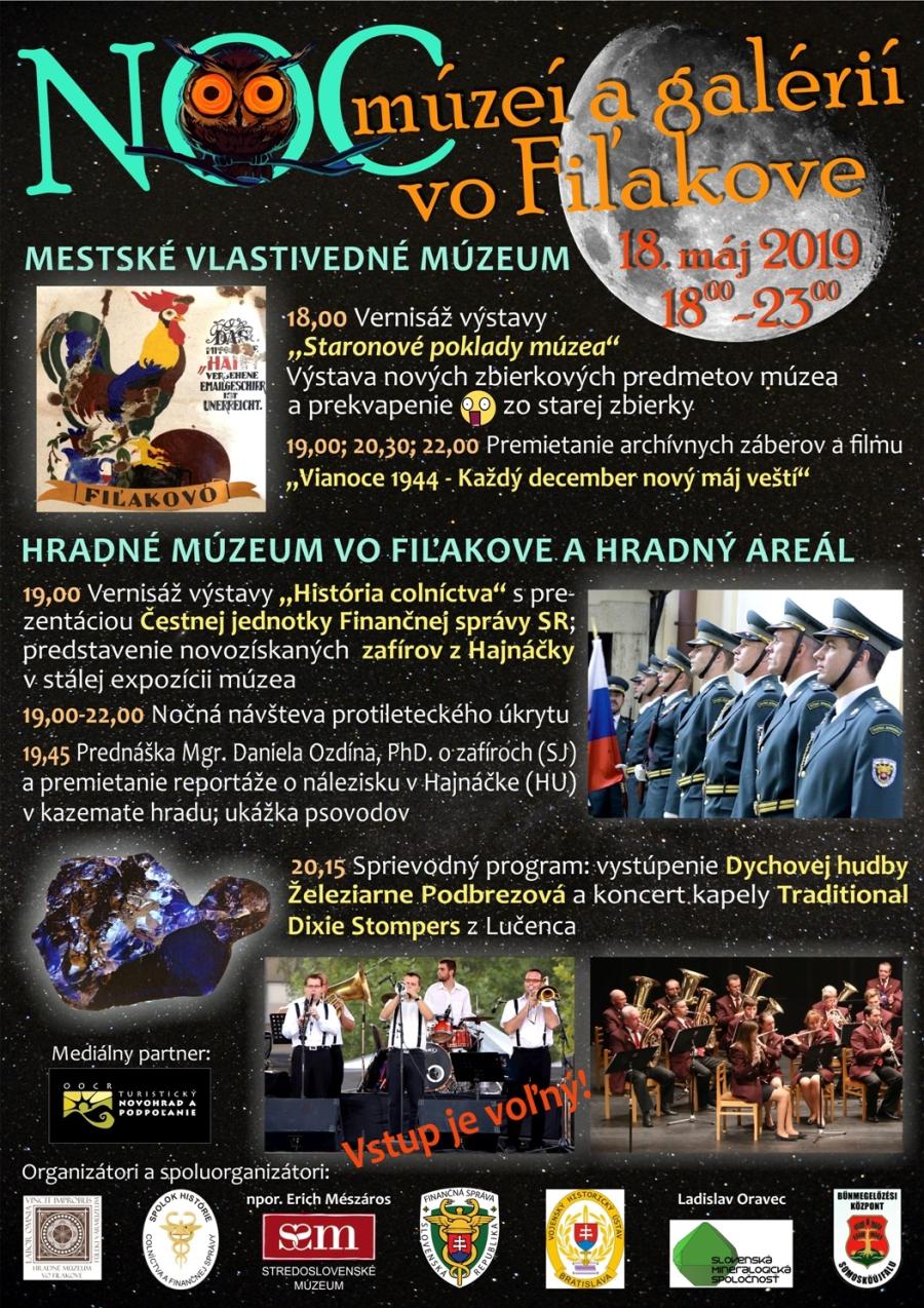 18.05.2019 | Hradné múzeum | Mestské vlastivedné múzeum Už po dvanásty krát sa Hradné múzeum vo Fiľakove zapája do celoeurópskej iniciatívy Noc múzeí a galérií. Podujatie s bohatým programom sa uskutoční 18. mája 2019. Prvým dejiskom bude už tradične Mestské vlastivedné múzeum, kde sa o 18:00 hod. otvára výstava s názvom „Staronové poklady múzea“, ktorá predstaví nové zbierkové predmety inštitúcie. Za posledných šesť rokov pribudlo do zbierZverejnené 10.5.2019 -dk-